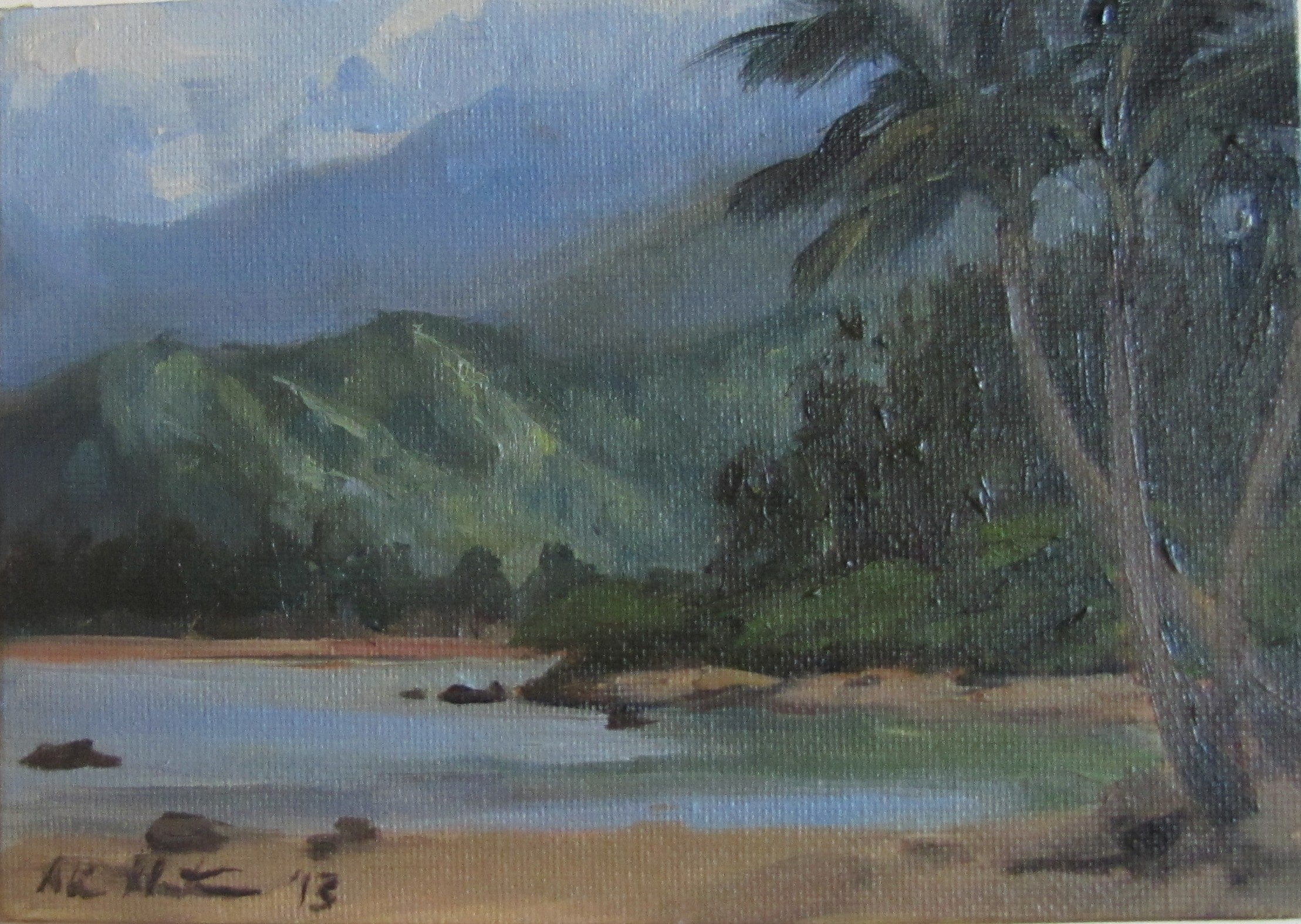 This was painted on the North side of the island near a surf break called Waikoko’s. The approaching clouds were threatening rain. Great to capture the mysterious play of mountain and cloud patterns. Not so great if you are trying to stay dry.